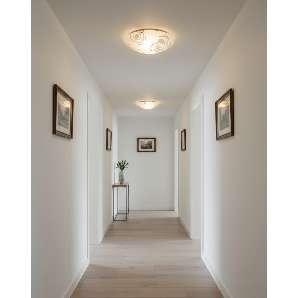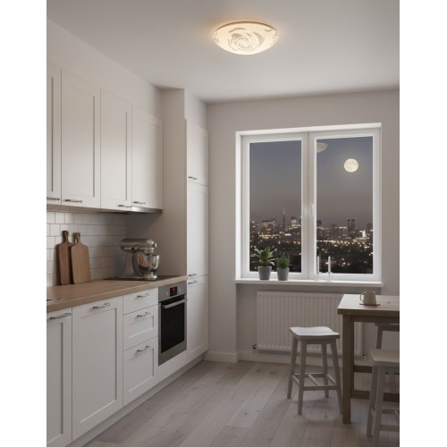 - 30 cm. çapında ideal boyutu ve yüksek ışık geçirgenliğine sahip serigrafi baskılı camı ile homojen bir aydınlatma sağlayan bu plafonyer, minimalist tasarımıyla tüm iç mekanlara uyum sağlar.